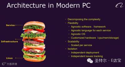但这个问题的解决之道并不像服务端。在这个过程中我们全面反思,大家看到这张图里面我们用了一个形象的比喻来体现传统的服务端软件。最下层是操作系统,通常是linux,最上层是我们的业务功能和服务。在服务端架构,我们很习惯用增加一个架构层次的方式来解决问题。例如缓存层、数据访问层等。我们在架构上按照自己的意愿去搭建不同层次的衔接环节,使架构具有足够的灵活性和扩展性。即使堆成这个样子,它依旧是非常合理的。