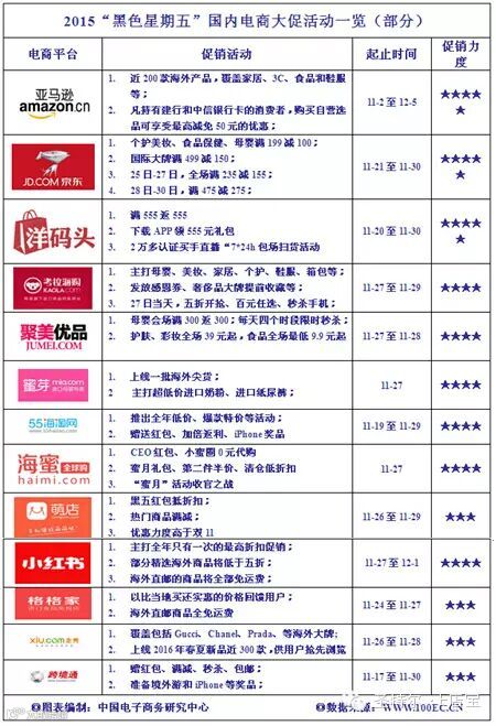 今年参与“黑色星期五”的电商有亚马逊中国、京东全球购、聚美优品、洋码头、网易考拉海购、蜜芽宝贝、55海淘网、海蜜全球购、萌店、小红书、格格家、走秀网、跨境通等。中国电子商务研究中心将要出版的《跨境电商2.0:新常态下“互联网+一带一路”》(详见:www.100ec.cn/zt/kjds)对上述这些跨境电商的模式、盈利能力、运营情况等进行了全面剖析。