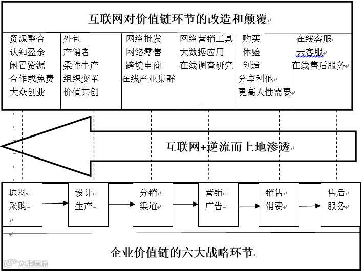 今天的互联网+浩浩荡荡势不可挡,正如阿里巴巴董事长马云所说,今天不做电子商务,明天将无商可务。在这样的形势下,传统企业的价值链环节正在逐个被渗透、改造和颠覆。简单分类来看,制造业通过直接上线而缩短链条和连接顾客参与到产品的设计生产中,生活服务业通过上线而缓解供求信息不畅的局面,也通过增加中间环节(携程、大众点评等中介)而实现了产需间更好的匹配,加速释放了服务业的产能,刺激了生活型服务的需求而带动国内经济的发展。价值链中间环节的互联网化属于过渡阶段和部分互联网化,最彻底的互联网化则来源于顾客需求端和企业资源端的新发现和新创造。需求端的创新指如何发现顾客深刻、隐蔽、高级的未满足的需求,通过全新的产品服务开发而创造全新的企业或组织。如开源运动、百度百科等就体现了网民内心潜在的创造需求和利他主义精神,这是一种依靠现有商品和服务无法满足的个体更高层次的自我实现和自我超越的需求,是被互联网世界和社群组织激发出来的个体体验和创造行为,这种行为集结而成为互联网平台上的一种全新服务和组织机构。来自企业端的资源创新,则是对闲置传统资源和个人认知盈余的利用,如P2P互联网金融服务平台整合的是个人手上的闲置资金,Airbnb整合的是个人闲置房源,滴滴整合的是个人闲置私家车和空闲时间,阿里巴巴集团整合的则是所有创业者的创业资源和个人精力,这种来自于顾客端和企业端的创新是互联网+在企业商业模式上的极致体现,这是对传统价值链的颠覆和重建,也是传统产业互联网化努力的方向。在互联网+的影响下,产业结构不再是线下垂直分布的一条条单向价值链,而是线上线下相互连接和交织的价值网络,互联网平台型企业成为互联网+产业结构的交通枢纽和调度中心,通过线上的消费者洞察和大数据分析,更好地服务于线下产业的设计生产和资源整合。总之,从微观来看,互联网+是一场C2B驱动的逆流而上的价值链渗透、改造和颠覆运动,从消费端开始沿价值链向纵深渗透,逐渐改造价值链中的各环节和各主体,从而产生了不同创新程度的产业互联网+现象和新型商业模式,最极致的创新则是企业资源端和消费需求端的全新发现和创造。