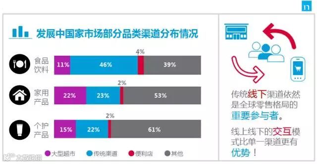 尼尔森报告还提出线上销售的2个阻碍和2个促进因素。一般而言,可积累库存,具备稳定的消费周转率的品类,如个人护理品和家庭用品是电商首选;从价格维度来看,低运输成本,利润空间高可允许较大范围折扣的商品同样适合线上销售。而便利性和即时消费则是线上销售的两个障碍。此外,一些特殊需求或需求正处于增长阶段的品类,例如许多发展中国家消费者对新鲜、自然、无加工食品的强烈诉求,使之成为电商的一个优质之选。