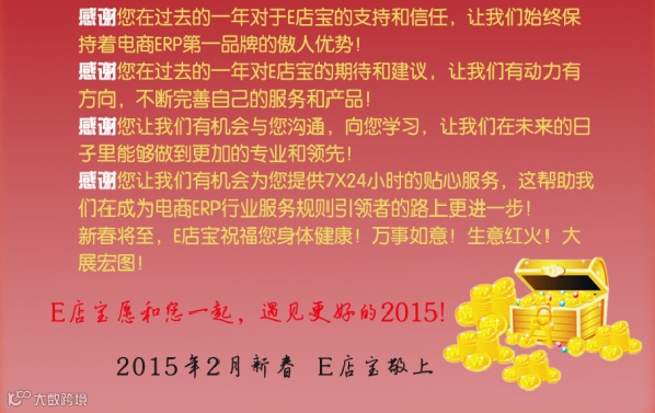 导读:当2015羊年新春的钟声即将敲响,E店宝人心中涌动着感恩和祝福!感谢您的支持和信任,让我们始终保持着电商ERP第一品牌的傲人优势!