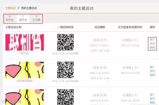Step6管理“我的主题活动”,可以对已创建的活动进行推广、修改和删除。目前推广点默认为手淘无线店铺首页,后续会开放天猫客户端详情页以及更多推广位置,商家可自行选择。