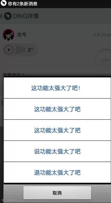 钉钉的另一点强大之处在于随时“DING一下”,对于没有收到的用户,老板还可以将内容以电话录音或短信的方式发送到对方的手机上。而你不仅仅可以在电话端 收听留言,还可以按“1键”进行语音回复,按“2键”重复收听。与此同时,钉钉App中会保留用户发送以及接受的DING消息,便于用户随时收听。同时, 该功能支持多人群发,用户可以在App端选择让哪些好友收听消息。