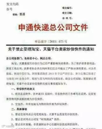 该微博同时配发一个抬头为申通快递总公司文件的图片,图中标注关于禁止受理淘宝、天猫平台卖家炒信快件的通知。