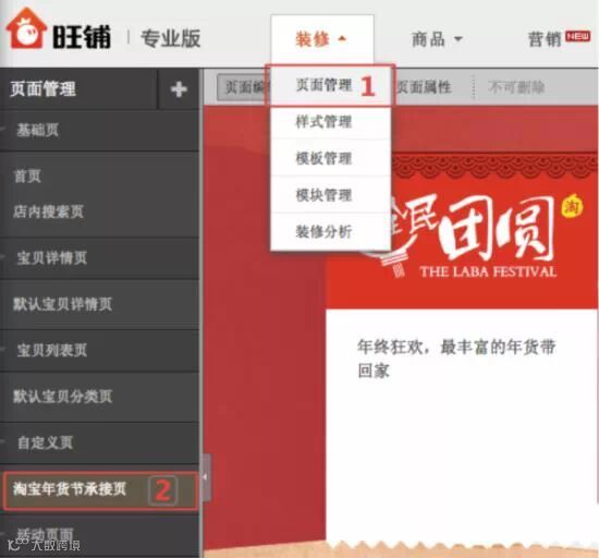 进入旺铺装修后台,选择页面管理,点击左侧淘宝年货节承接页。