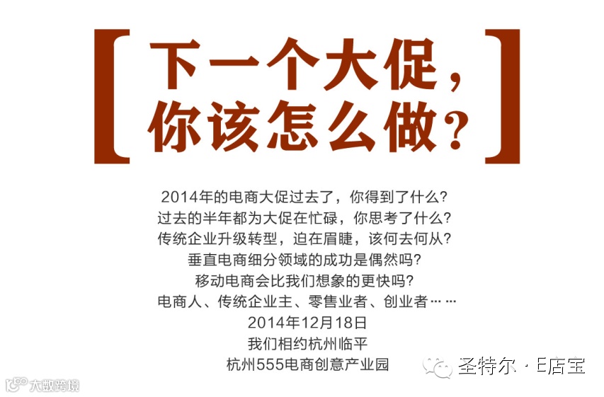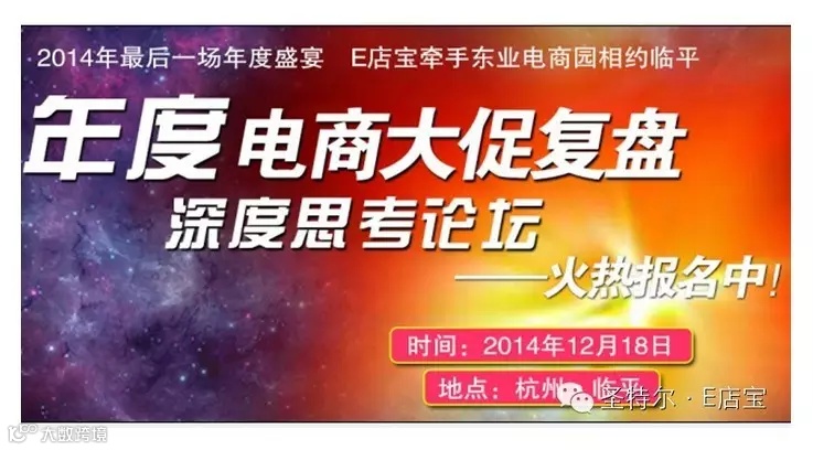 2014年最后一场年度盛宴火热报名中,E店宝12月18日与你相约临平“年度电商大促复盘深度思考论坛”,精彩不容错过!还等什么,赶快报名吧!