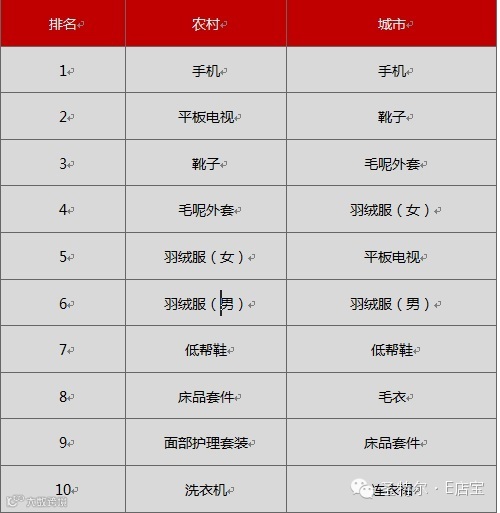 表1:2014年双十一农村和城市成交额TOP10品类对比