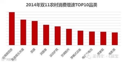 对比去年双十一农村消费情况,增速排名TOP10榜单充分体现出农村生活品质和质量的变化,出境跟团游独占鳌头成为2014年双十一同比增长最快的品类,娱乐影音充值、电影票等娱乐产品也赫然在列,这些娱乐旅游类产品或服务需求的飞速增长正是越来越多的农村消费者追求精神享受的最佳刻画。