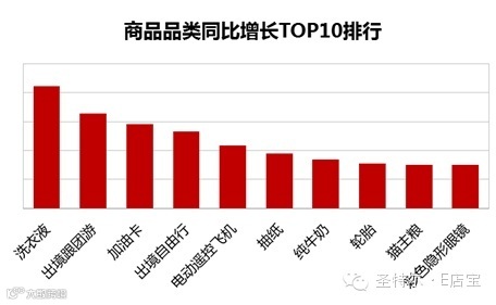 值得关注的是,轮胎与加油卡此次上榜,预示网购已开始向汽车行业的更深层次渗透,未来一段时间仍有较高的成长潜力;另有遥控飞机(儿童玩具)上榜。