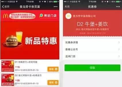 除 了可以获取用户设备网络状况,开发者还将能获取用户卡券使用状况。微信开放卡券接口之后,商户可以在网页中批量添加多种卡券,并直接为用户展示其附近的门 店能够使用哪些卡券,引导其选择领取。更重要的是,商户在后台的“用户选择列表”中,可以快速了解相应商圈的用户喜好、整体产品受欢迎程度等,比如XX小 区附近用户更爱“牛堡+姜饮”,以便后期的商品调配与优化经营。