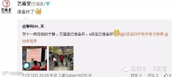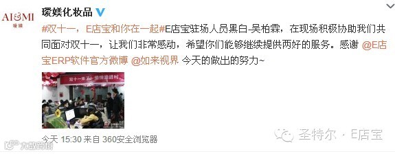 圣特尔·E店宝1分56秒!3亿! 13分53秒!50亿! 17分15秒!60亿! 21分35秒!70亿! 27分05秒!80亿! 32分11秒!90亿!今年双十一2小时就达到了去年10小时的成绩,够劲爆!在这激动人心的时刻E店宝的小伙伴都在干嘛?