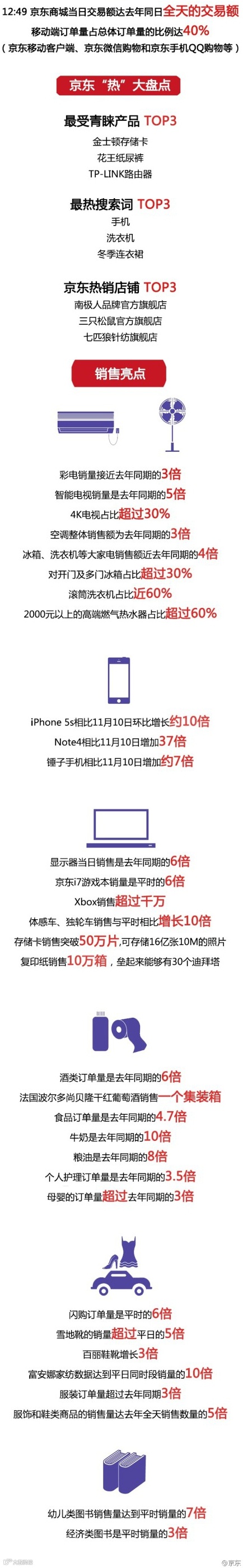 而且在大促中,京东移动客户端、微信购物、手机QQ购物等平台相互协同,移动端下单总量占比超过40%,下单量是去年同期的8倍。