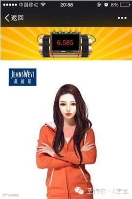 在20秒钟时间内为男神/女神“拆炸弹”(即滑动屏幕,能脱掉一件衣服,最终拆掉炸弹)。整个游戏过程实则是完成了真维斯的换装秀,增强用户对真维斯品牌风格的印象。