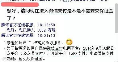 微信支付的官方在线客服基本上已经对这一情况有统一的回应。“为了给更多的用户提供微信支付电商平台,2014年9月10日起公众平台(公众号支付)、开放平台(App支付)申请微信支付功能,暂免收保证金。”