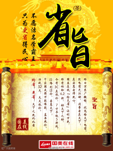 国美在线再6月4日回应一篇微博,以“省旨”(谐音:圣旨)为题,还是以购省到更省为核心来对应如何得民心。