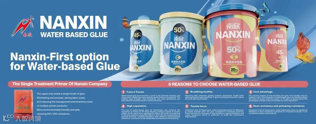 中国南欣控股有限公司是一家中外合资,专业从事鞋用胶粘剂研发、生产与推广的现代化高科技企业。主要产品包括胶粘剂、表面处理剂、硬化剂及新型无三苯系列产品,在新一代水性,环保节能,环保喷胶有着很好的贡献。产品使用范围覆盖到国内外等众多知名品牌。