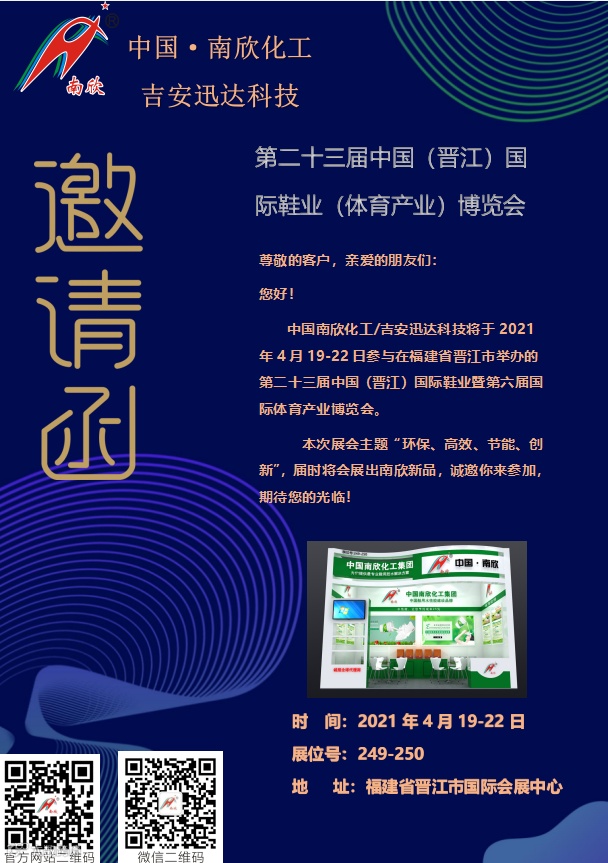 中国南欣化工/吉安迅达科技将于2021年4月19日~22日,参与中国福建省晋江市“第二十三届中国(晋江)国际鞋业(体育产业)博览会”。
