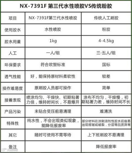NX-7391F 第三代水性喷胶 VS 传统粉胶