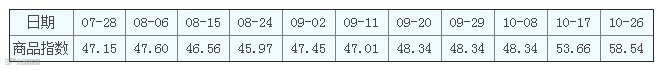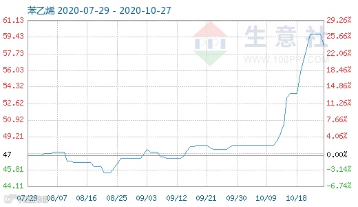 10月26日苯乙烯商品指数为58.54,较昨日下降了1.18点,较周期内最高点120.11点(2012-10-29)下降了51.26%,较2020年04月02日最低点41.09点上涨了42.47%。(注:周期指2011-09-01至今)
