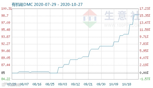 10月25日有机硅DMC商品指数为98.97,与24日持平,较周期内最高点115.24点(2017-04-18)下降了14.12%,较2016年07月27日最低点70.40点上涨了40.58%。(注:周期指2011-09-01至今)