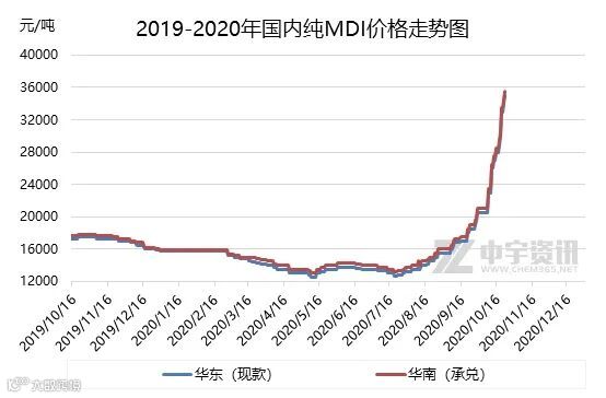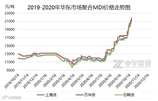 十月份的MDI市场无论是聚合MDI还是纯MDI亦或是液化MDI及MDI-50,走势都十分亮眼,尤其是纯MDI,节后归来第二周周涨幅达到7000元/吨,毫无疑问的在本周的中宇资讯监测化工产品涨榜中位居前列,聚合MDI走势同样不俗,在上周突破20000元/吨关口后本周继续上行,周涨幅1300元/吨亦是相当可观。