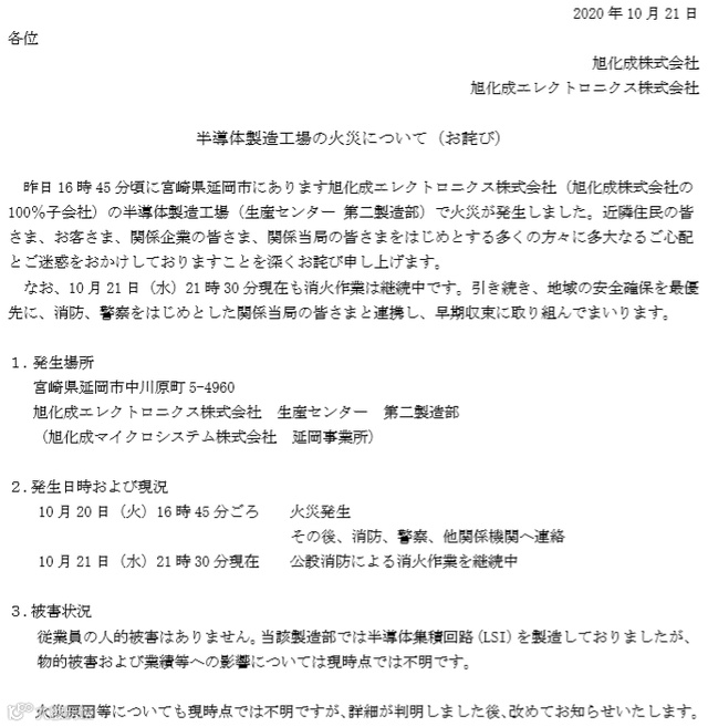 国际电子商情查询得知,旭化成21日晚间也通报了火灾情况,并在公告指出,旗下子公司负责制造LSI的工厂因火灾停产。