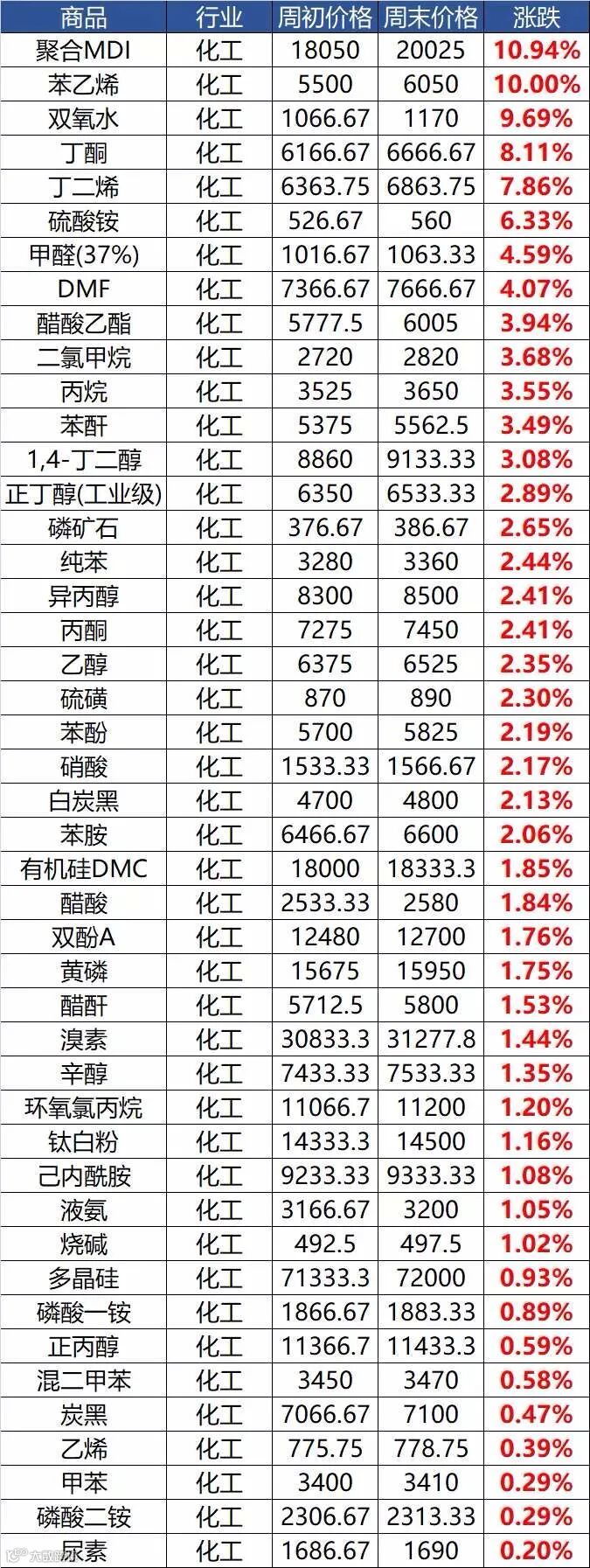 我国三季度GDP继续回升,前三季度经济增速由负转正,规模以上工业增加值增速月度同比已恢复到疫情前的水平并有望持续保持增长之势。基于国内经济基本面持续向好,各项经济指标稳步回升,宏观氛围偏暖,叠加“金九银十”传统消费旺季预期共振,化工板块整体表现积极,化工品种涨多跌少。