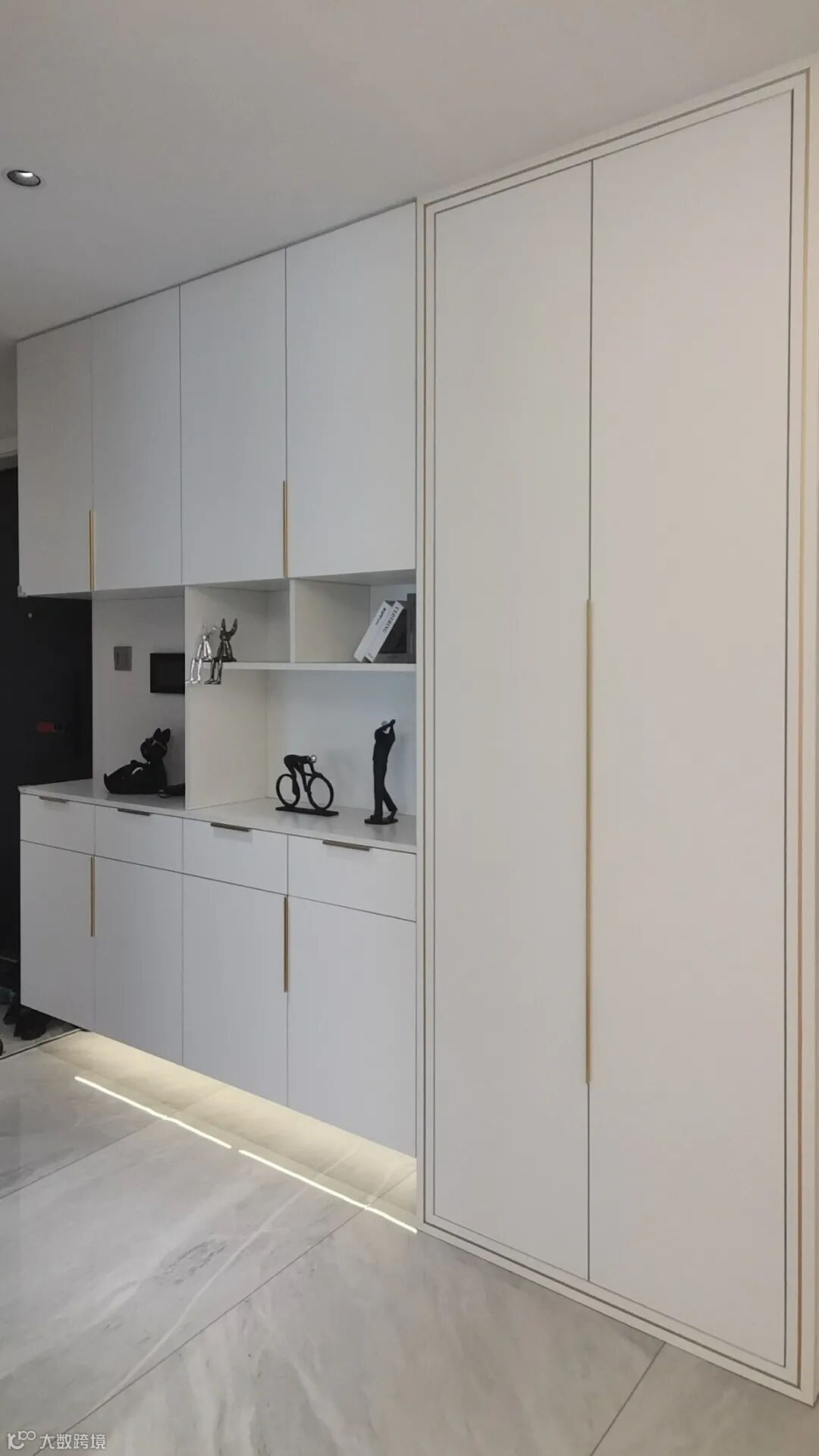 一进门的玄关柜就非常的宽大,让胖哥对这个户型的第一印象很不错。女主人非常细心的准备了鞋套,胖哥用这时间非常仔细的看了看这个玄关柜,别的不说“真·柜门到顶”确实漂亮。封板隐藏在柜门后面,显得足够的大气。这就叫细节啊。