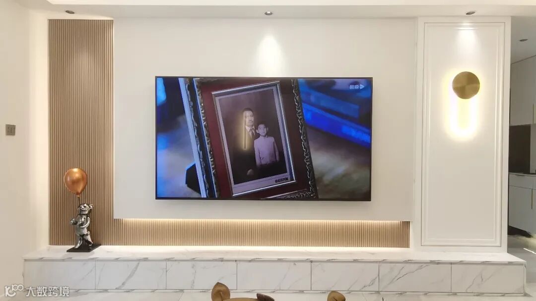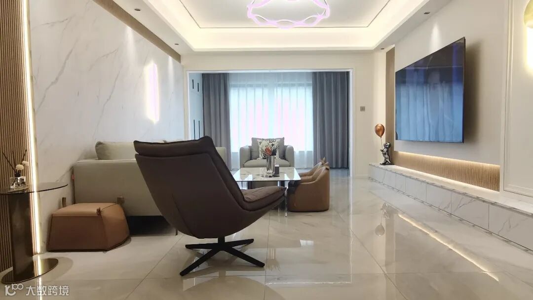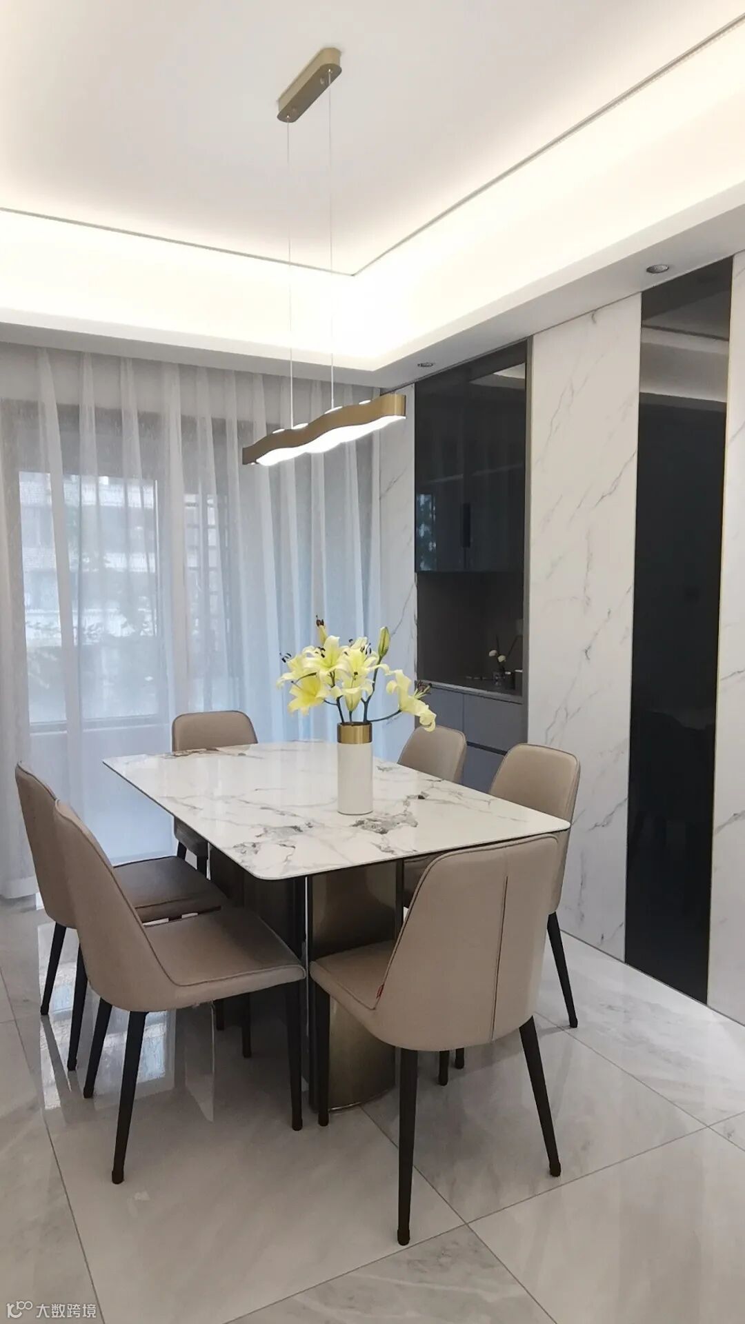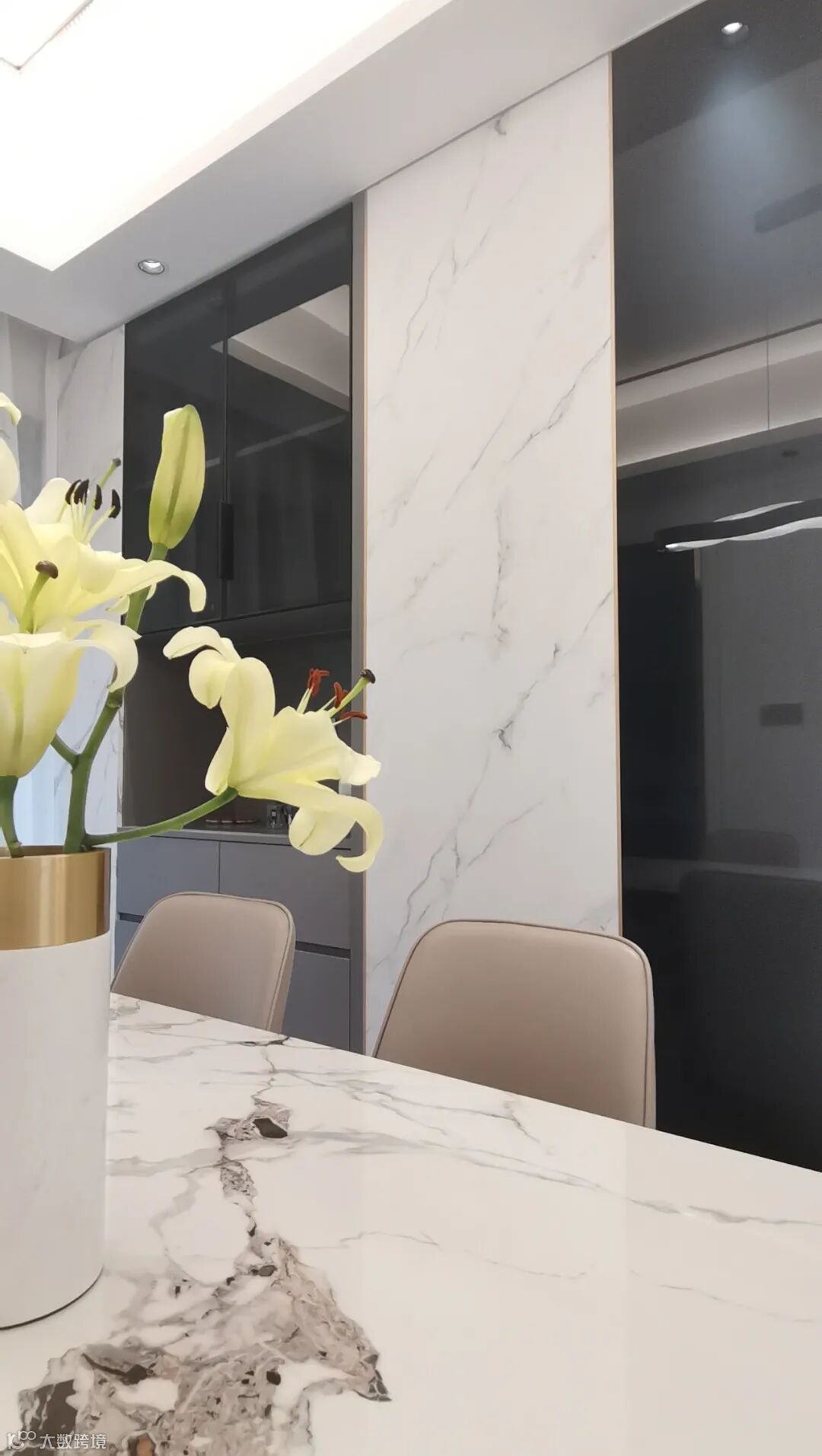 大理石纹饰搭配金色的点缀随处可见,玄关的墙上,沙发背景墙,电视柜,餐边柜……串联了整个屋子的设计感。