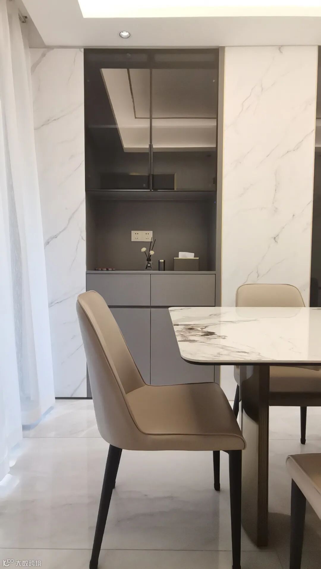 这个餐边柜和玄关柜一样做得非常漂亮,和客厅一样用了大理石纹饰,餐桌的岩板也是同样的纹理。风格上保持了统一。