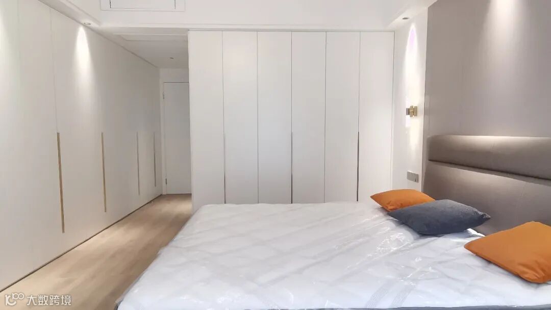 主卧放弃了电视墙,几乎完全覆盖了一门到顶的衣柜。女主人一定非常注重收纳,这个量级,这房子过十年估计都不会显得乱吧。