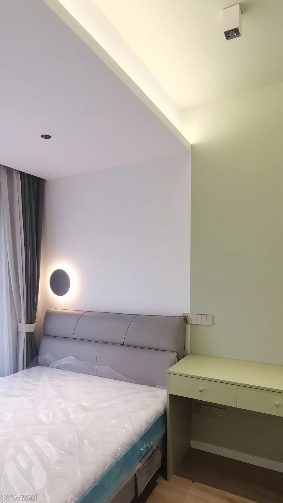 墙壁上的绿色间隔,不仅给整个空间进行了功能区分,也很好的点缀了整个白色的空间,同色的壁灯与它相互呼应,很好的诠释了简单不等于没有设计感。