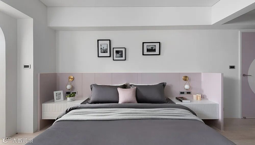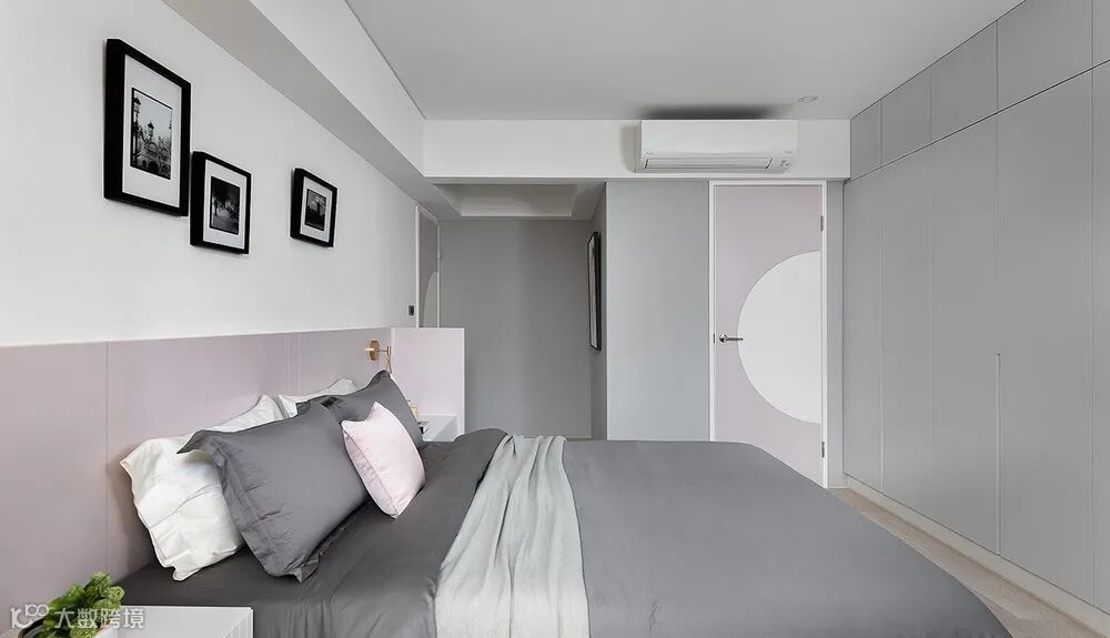 主卧是温柔缱绻的粉灰调子,床头板做成了围栏式,背景墙和床品都是高级的粉色和灰色。在床尾处打造整面墙的衣柜,收纳空间很足。中性灰调的墙面和衣柜门平衡空间氛围。