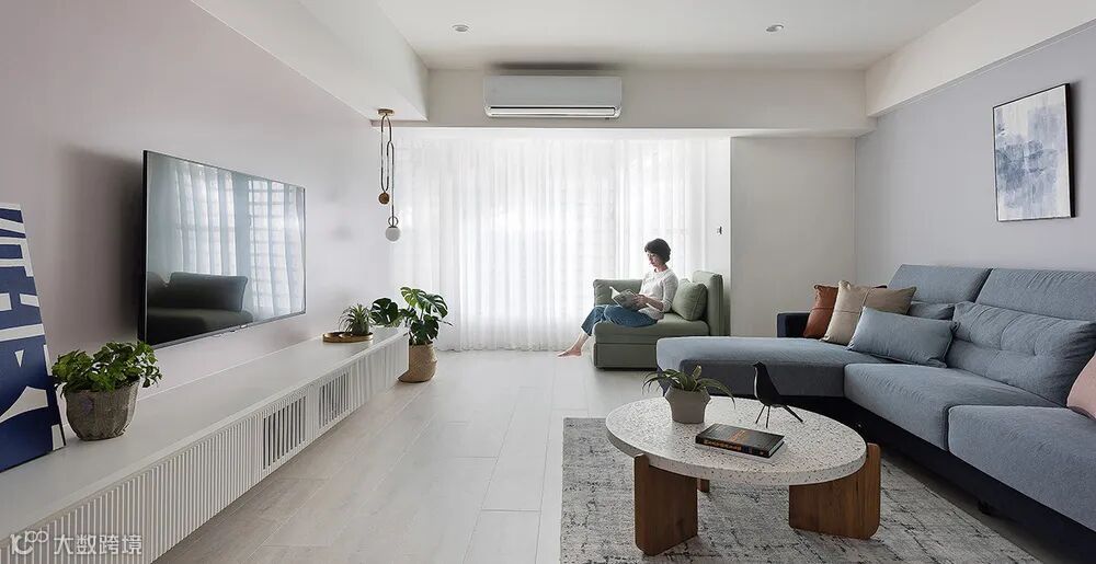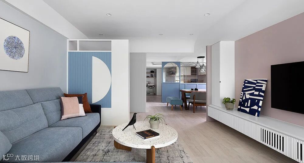 玄关的隔断到了客厅变成了蓝白色,与中性沙发背墙、雾霾蓝布艺沙发和水磨石茶几相互过渡呼应,视觉上特别协调。
