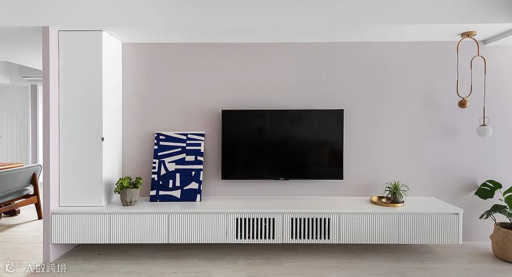 客厅的电视机旁的吊灯以简约线条呼应半月几何造型,电视柜柜门用隔栅减轻柜体份量,悬空不落地的设计是为了能让扫地机器人穿梭自如。