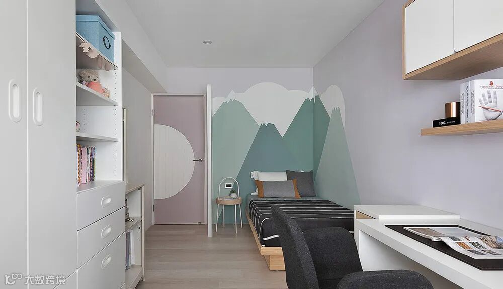 儿童房是狭长型的,但是睡眠区、储物柜和书桌一个都没少。只要不强求1.5米的床,还是能做好整体规划的。