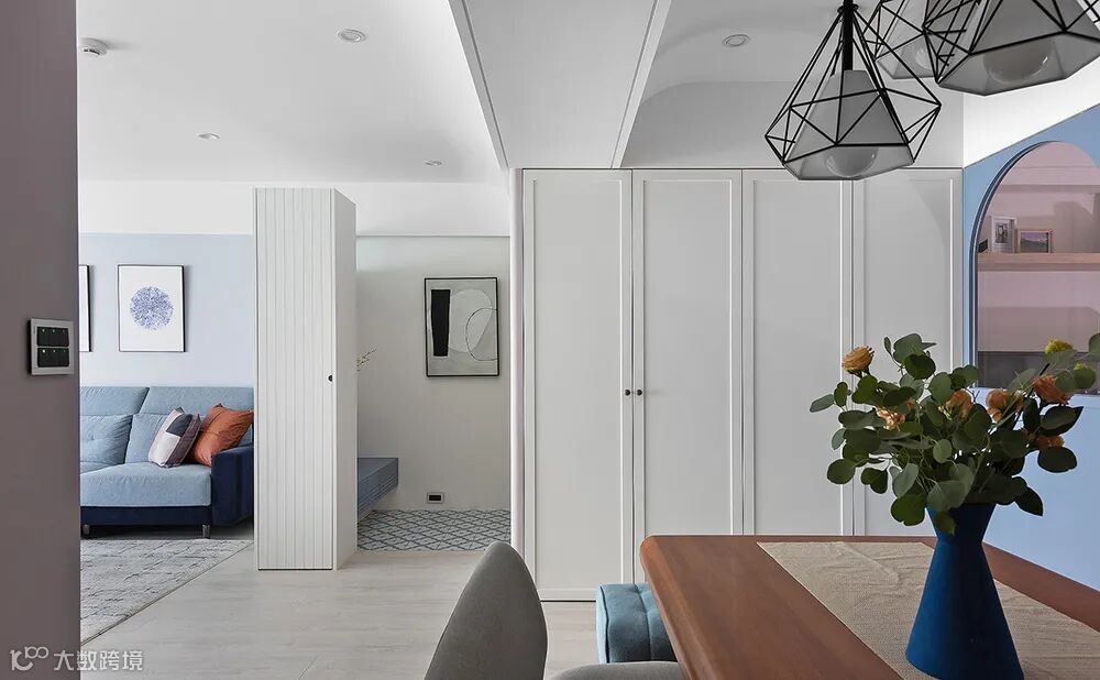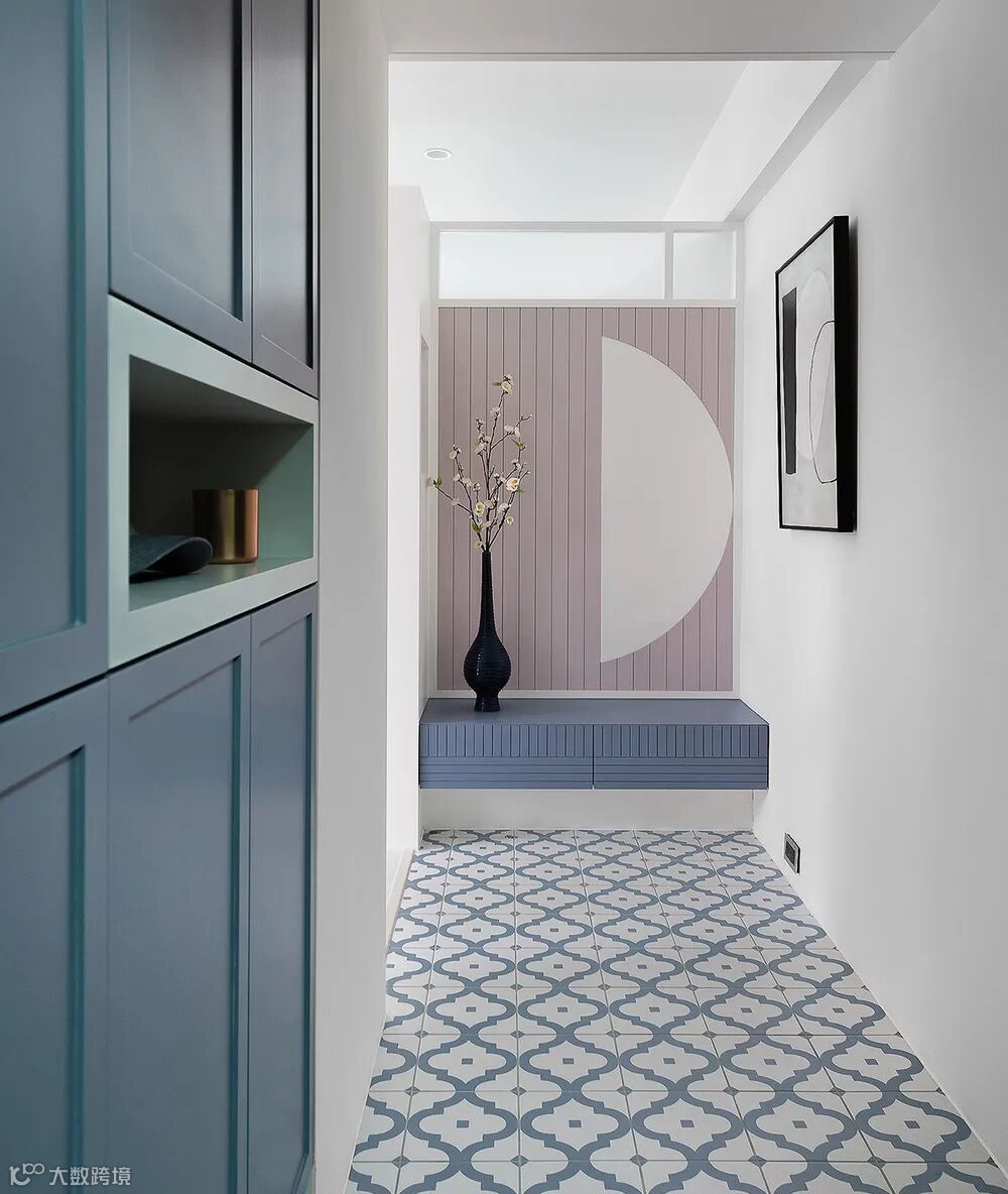 莫兰迪北欧风玄关,这样一进门就让人心情缤纷起来。正对面是日本传统抚子粉色搭配白色半月几何隔断,避免「穿堂煞」。下端蓝色柜体既是抽屉,也是换鞋用的座位。几何花砖用的也是蓝白色系,基本和玄关柜+白墙呼应,还增加了异域风情。