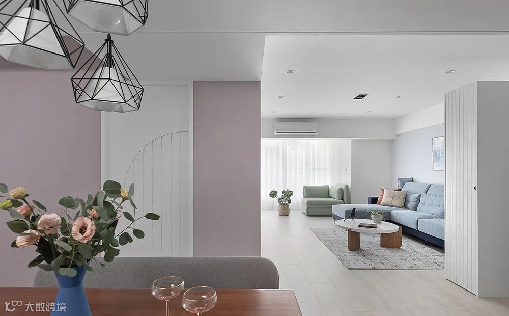 小两口因国外旅行而结识,那时候,喜欢去咖啡厅、小酒馆、电影院享受仪式感。有了两个女儿后,他们以家庭为中心,渴望有个既能够听见孩子们的欢笑,同时也能够如往常享受浪漫生活的居所。所以他们的家,便是在照料孩子与约会的情境之间,对于生活的平衡诠释。两个女儿正是活泼好动的年纪,他们希望将客厅打造为孩子可以自由玩耍的天地,所以客厅尽可能保持宽敞,家具陈设以简单不占空间为主。妻子工作之余喜欢手工制作包包,需要一个专属的工作区,而老公和孩子加班、学习也需要书桌椅,于是他们将书房打造成了全家的“工作”场所,独特又多能。全屋色彩选择偏少女心的「微甜莫兰迪」,在装饰元素上不求花样百出,但也要灵活有朝气,所以设计师运用几何花砖、半月几何图案、“变色”玻璃半透明门等,让他们的家既成为女儿向往的童话般的自由乐园,又充满小两口想要的精致浪漫格调。女主人希望这套北欧风的案例能给大家带来灵感。
