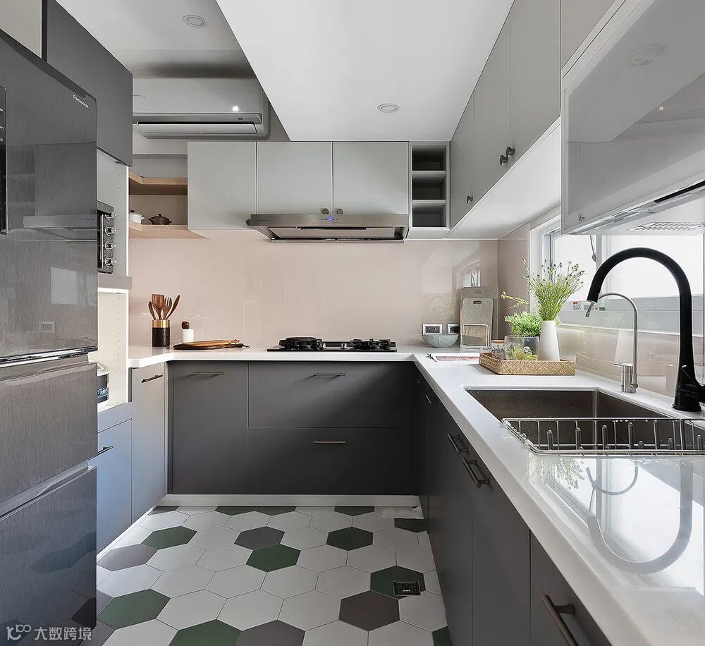 厨房是被众多莫兰迪色包围的一抹素色,清静的灰色,平衡整屋色调。与其他空间的划分巧妙运用了绿灰白几何花砖的设计,有趣又生动,更耐磨好打理。