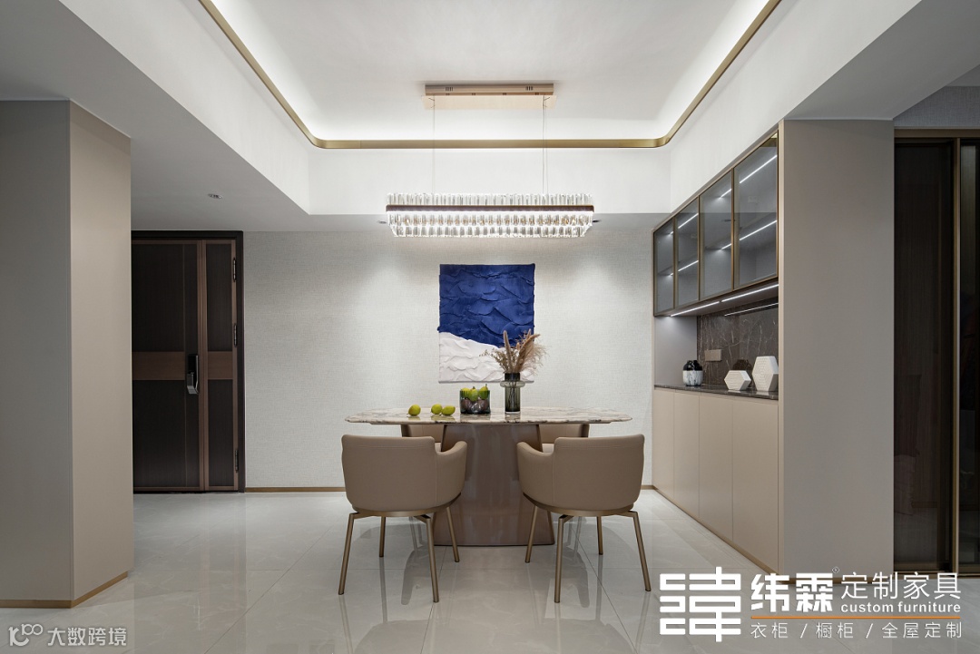 餐边柜上面是透明多宝阁的设计,防尘性能良好,视觉效果通透,墙面挂画色彩清凉,如夏天喝了冰水一样酣畅淋漓。