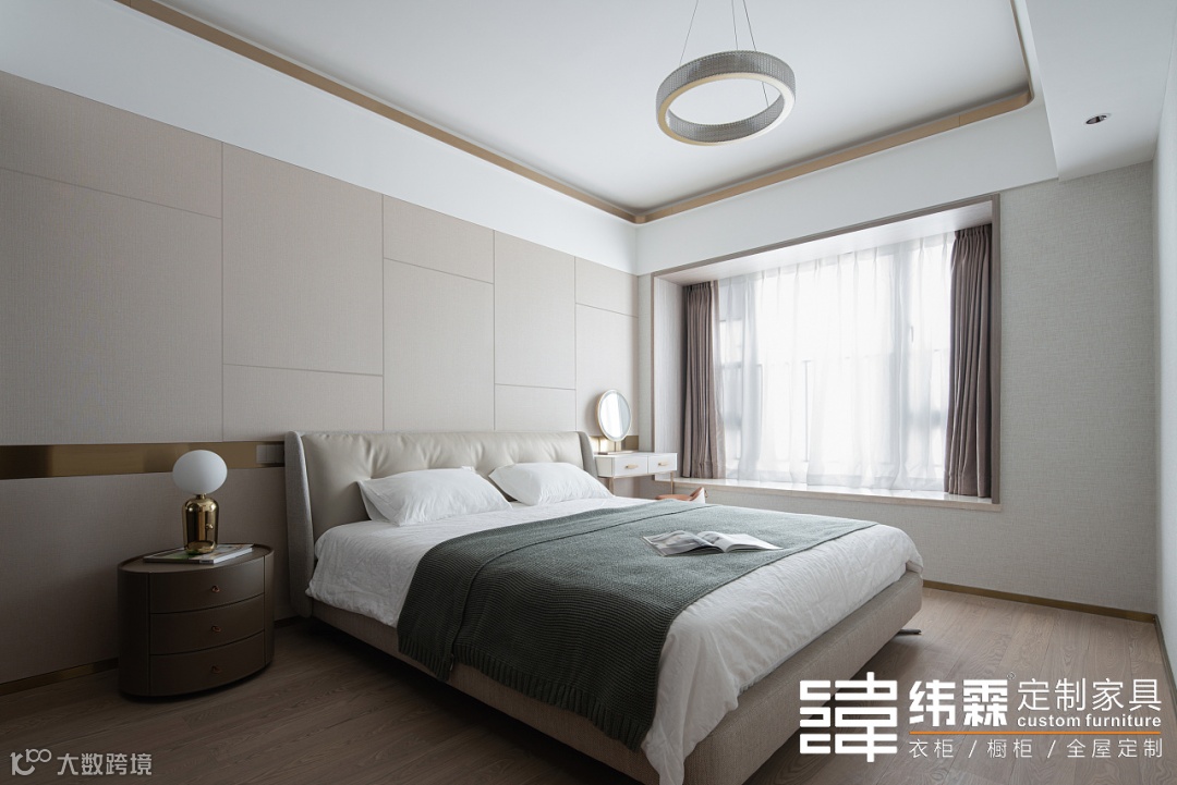 床头背景墙采用不规则的几何硬包拼接,原色的实木地板,简约大气的顶灯,宁静柔和的色彩,营造出温暖祥和的氛围,十分适合照顾宝宝的入眠情绪。