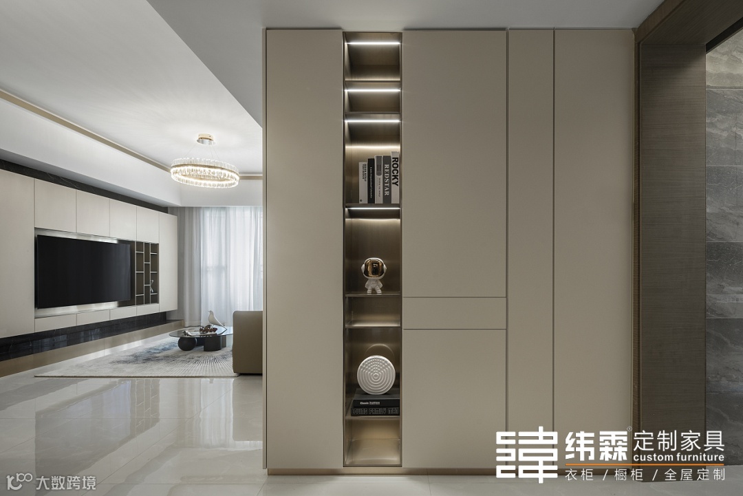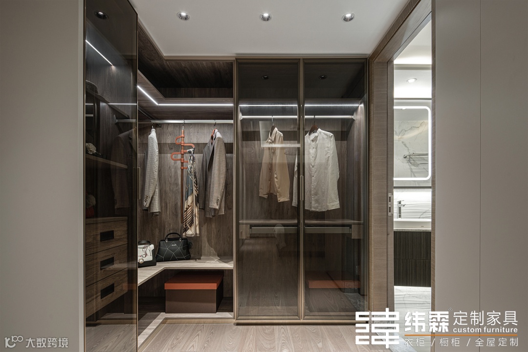 步入式衣帽间采用玻璃门设计,更具时尚和艺术观感,让生活从凌乱的环境中彻底解脱出来,干净、简洁、一览无余。