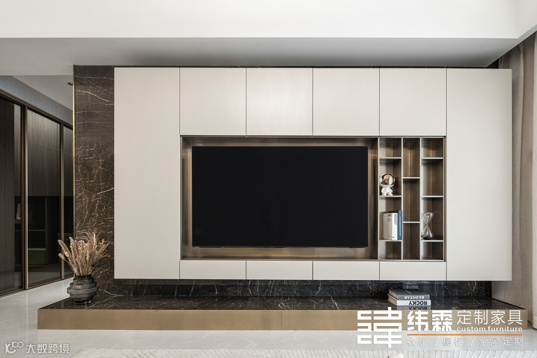 电视背景墙做了储物柜造型设计,丰富了客厅的储物空间,沉稳大气的大理石为电视背景墙铺设了一层沉稳厚重的底色,色彩和造型的搭配都十分协调。