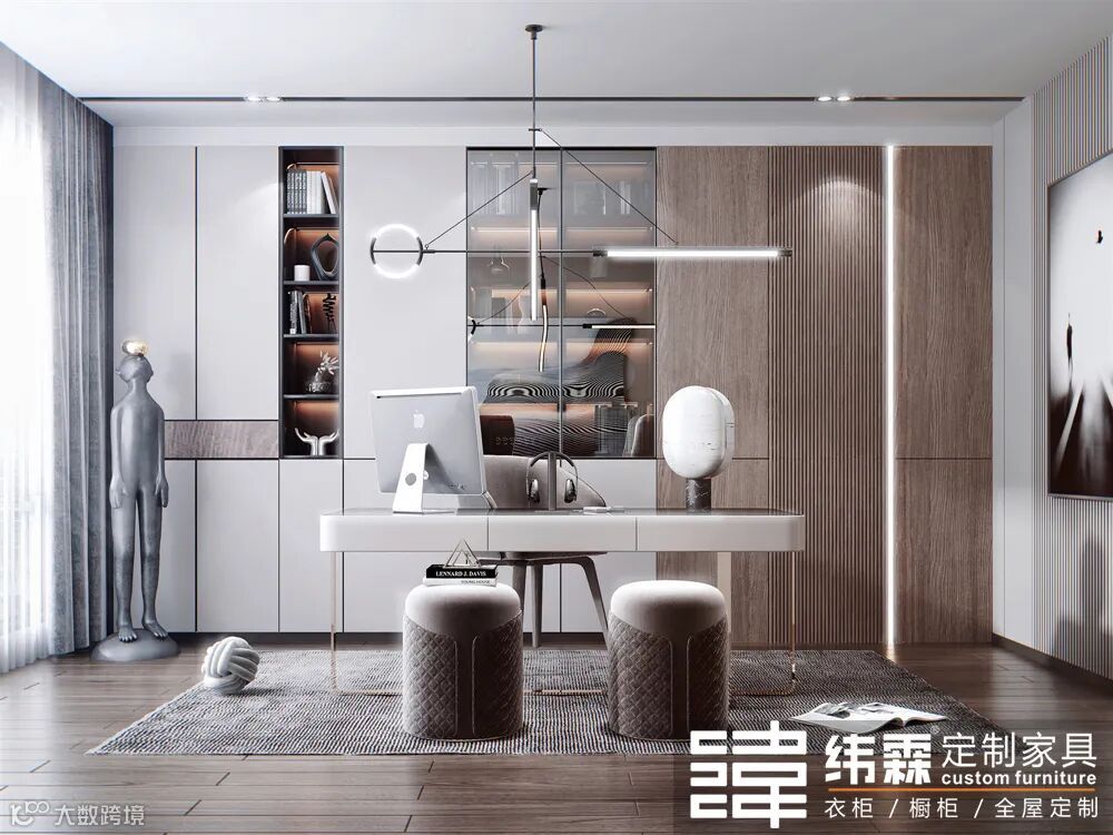 一侧为衣柜、一侧为书柜、写字桌的组合体,