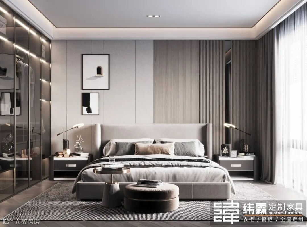主卧空间干净爽朗,背景墙用深灰与木纹作为背景,