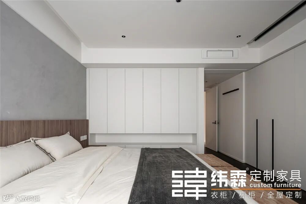 舍弃电视墙的卧室更显大方整洁,都用到顶的衣柜做收纳,一面掏空600mm提高收纳空间的利用率,想用时可以随手取出、十分方便;