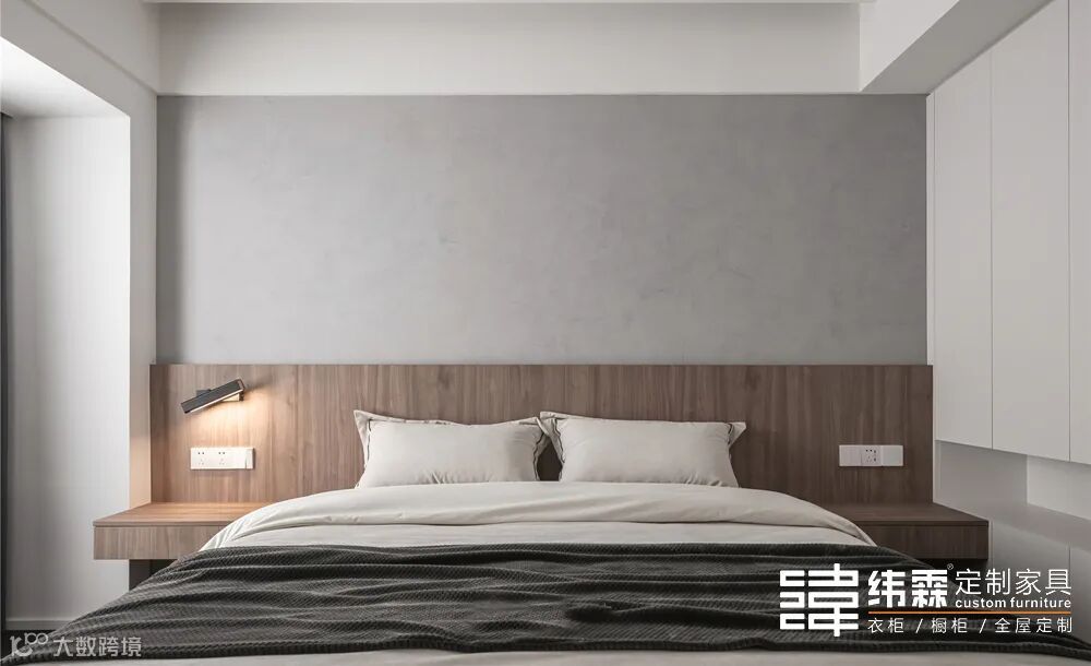 嵌入式床头的整体感更强,温润木饰面、灰色石膏板组成的背景墙,让卧室空间舒适而惬意;