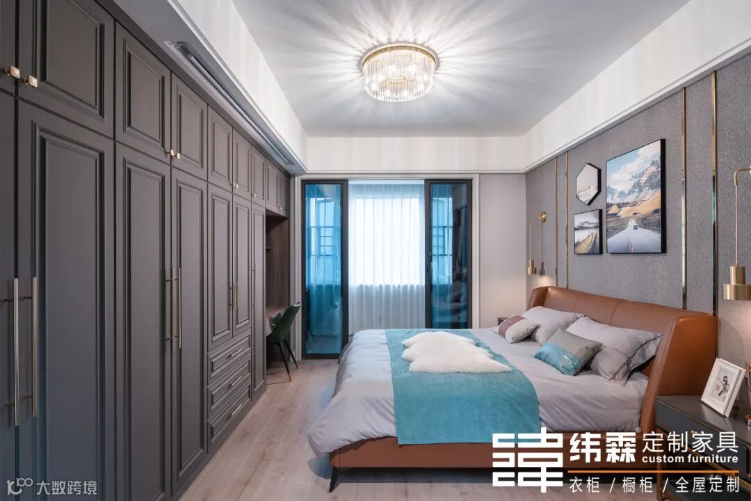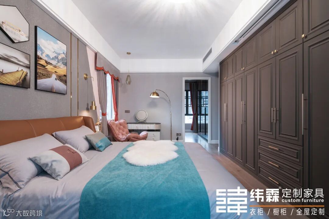 主卧柜子与线型灯的巧妙结合,打破白色墙壁的呆板,营造出空间的层次关系。