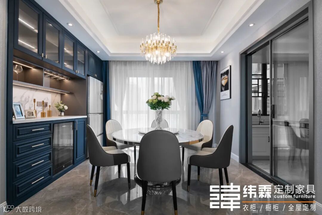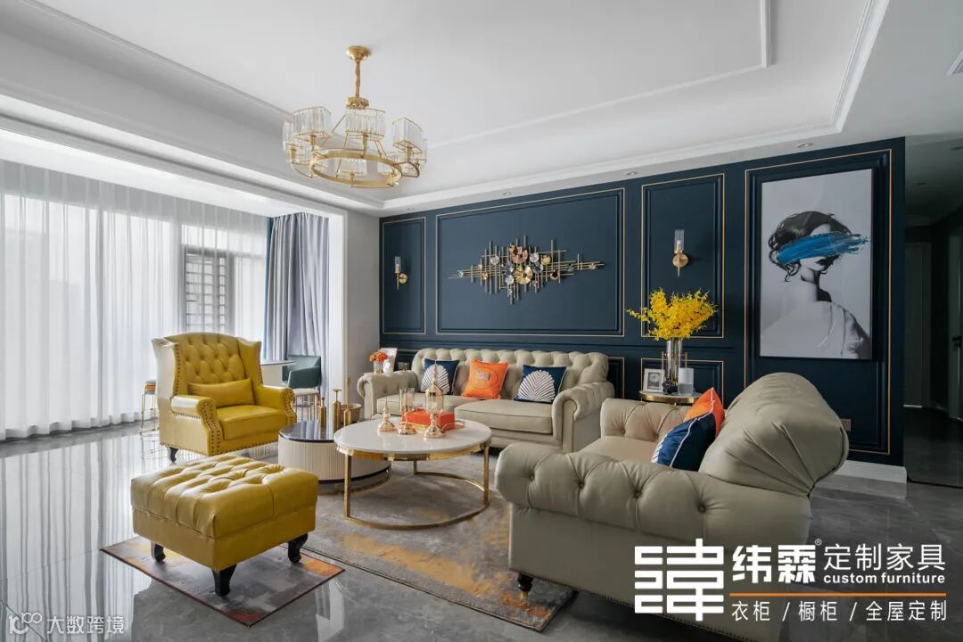 沙发背景墙采用吸塑肤感墙板,勾勒出细腻的层次感,如同将生活中琐碎闪烁的美好收拢进来,只待不日将它取出,细细品味。