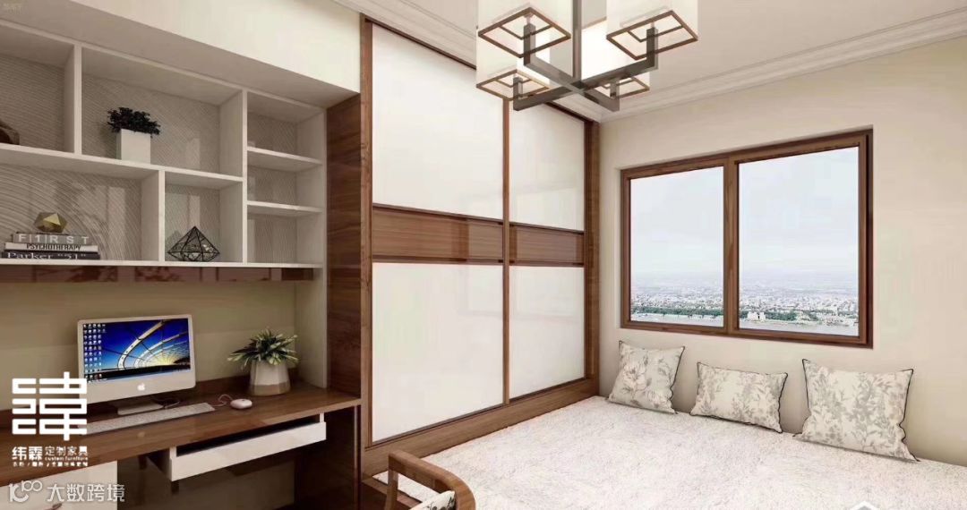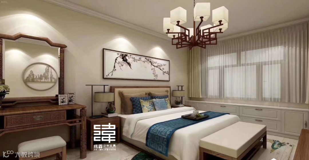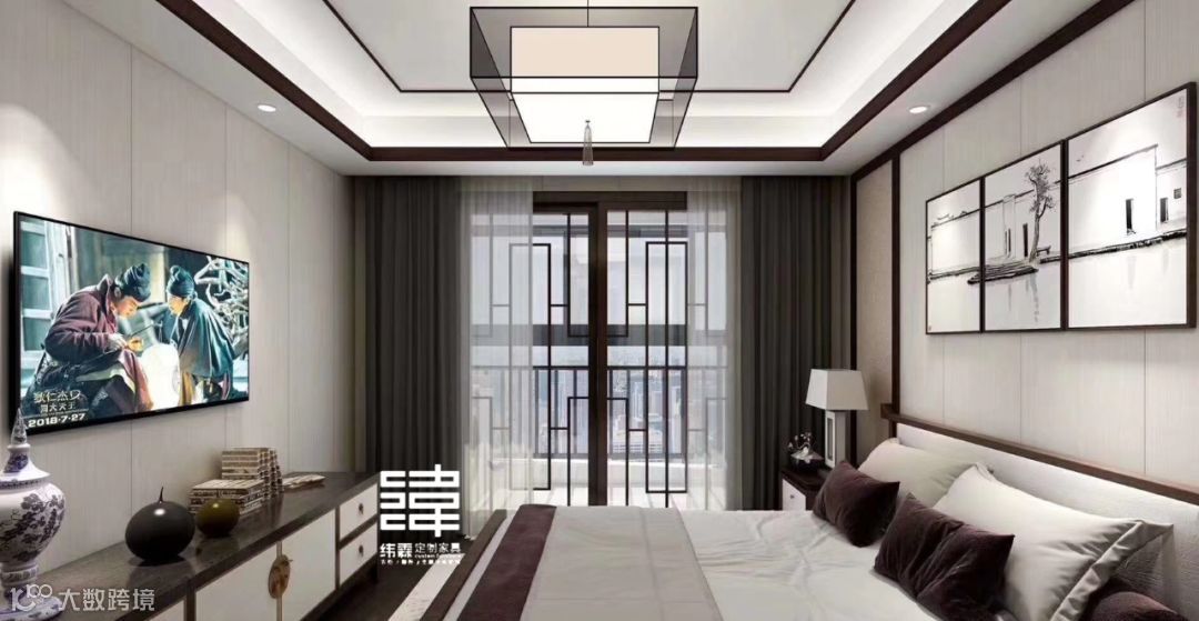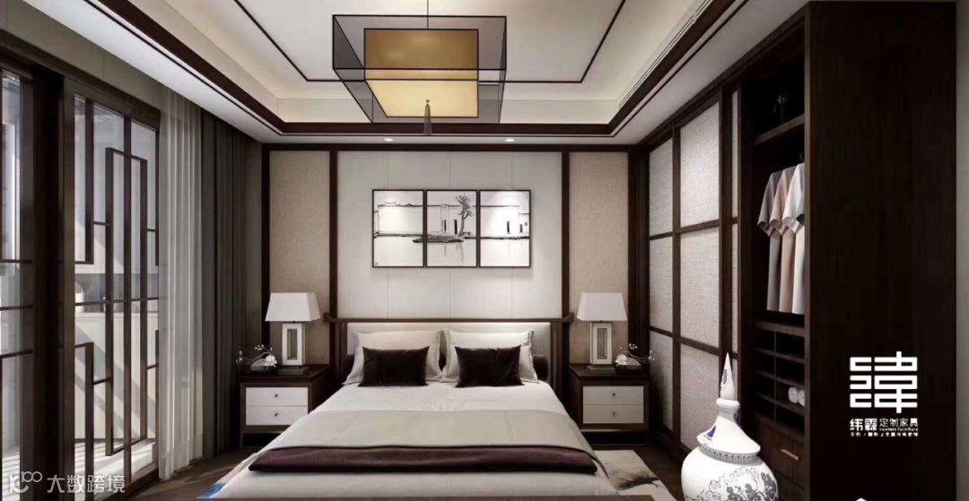 新中式里的主卧比较贵气和端庄,不同质感的材质装饰一个空间,看起来很有层次感,而且整个卧室的色调也搭配的很和谐,和挂画家具等众多物品一起相得益彰。而且卧室外的飘小阳台也布置的很优雅,可以喝喝茶聊聊天.